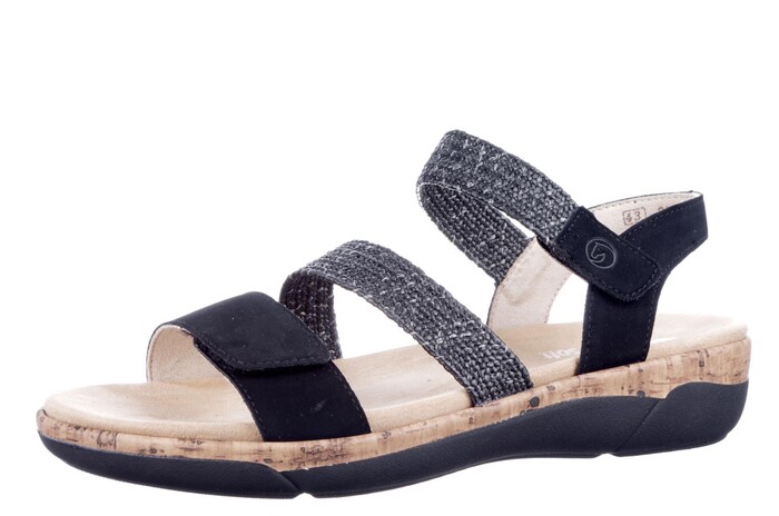 Remonte maakt al sinds 1876 een comfortabele en aantrekkelijk geprijsde collectie met  optimale pasvorm, breedtematen, verwisselbare inlegzolen en superflexibele buitenzolen. Comfort voor elke look gericht op moderne, sportieve vrouwen die naast kwaliteit ook een jong en stijlvol design belangrijk vinden. Deze sandaal met dubbele klittebandsluiting past perfect. Een elegant sportief model dat we in drie kleuren aanbieden: beige, zwart en groen.